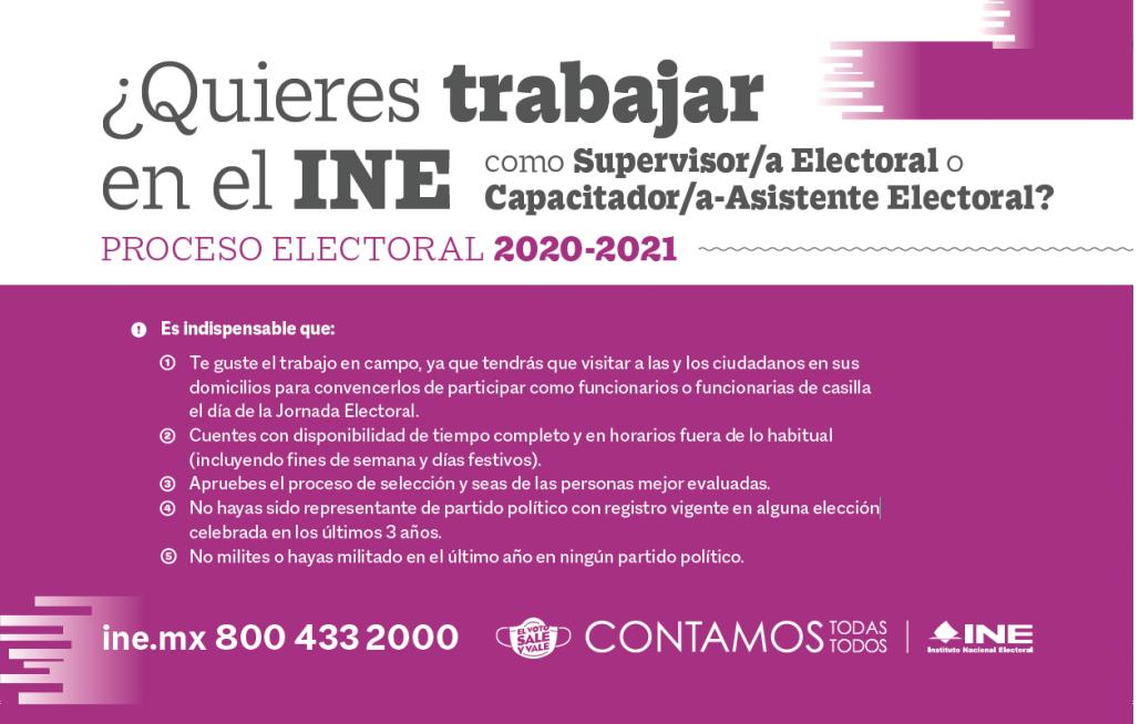 El ine te invita a colaborar como persona supervisora o capacitadora asistente durante el proceso electoral